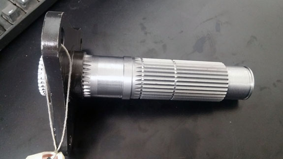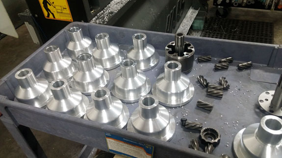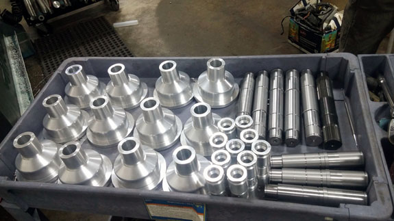 Center sprocket/torque splitter shafts are an example of lathe-vendor part. Tristan machined some D4 and D1 versions (the shaft-looking things in the cart), now they're off to splining. After that heat treat, followed by plating and then 'baking' to prevent hydrogen embrittlement. A completed older rev shaft is included in the picture for reference. Also in the picture are brake/clutch master cylinders, another lathe-mill-anodize part.