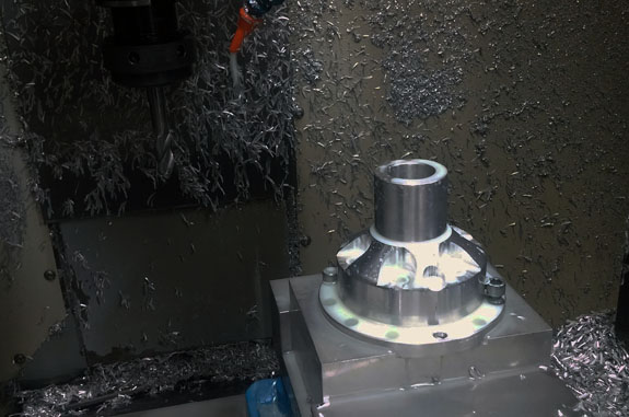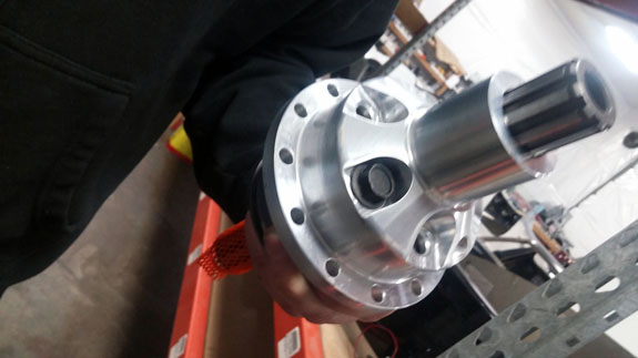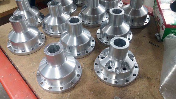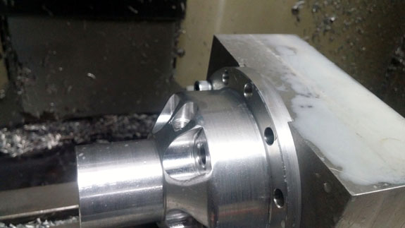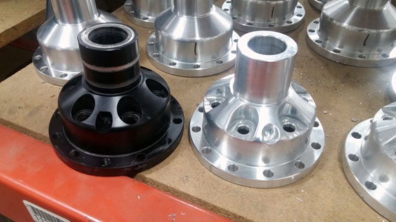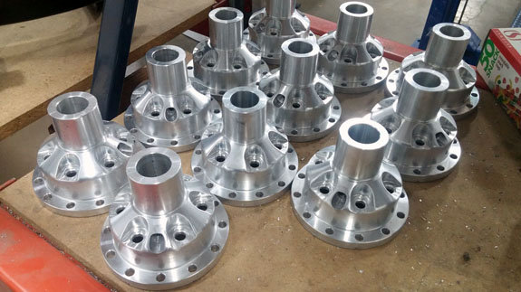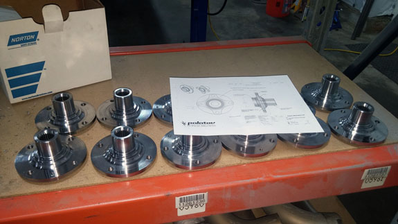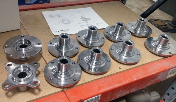 Wheel hubs are another example - this time we take OEM (VW) parts, then lathe and mill them to fit our purposes. The part on lower left is the completed version, before plating. The final machining steps remove a full pound of unsprung rotating mass.