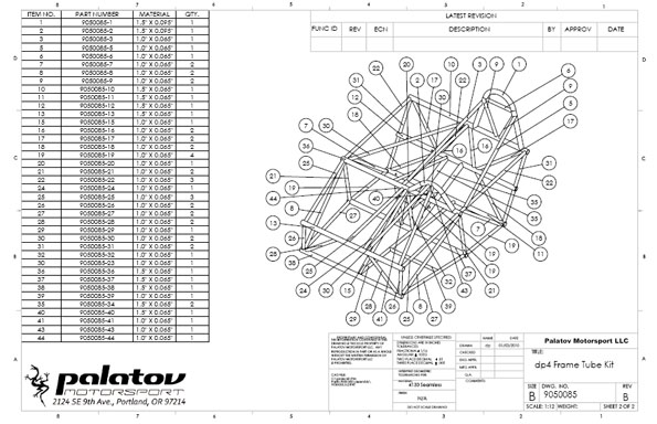 01/12/10 Getting the chassis ready for production is quite an ordeal. Each tube needs to be saved in a separate file, with its own coordinate system, and documented. There are 64 of them which makes the BOM drawing look like a pincushion, after a few days of work.