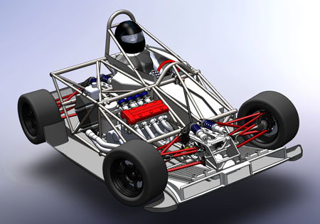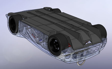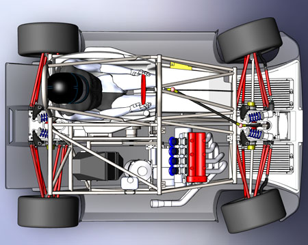 It also adds protection to the driver and other components in case of an off-track excursion. In the previous version, designed more with simplicity of manufacturing in mind, all the lower tubes were in a single horizontal plane which made a small portion of the driver's seat, the engine and the radiators hang below it. Probably OK 99.99% of the time, but... I'll feel much better having people drive this version at 160 mph than the previous one. Of course the prototype is being updated as close to this spec as possible - keeps Tristan busy :) A lot of work has also taken place on the suspension boxes, they are now almost 5 lbs lighter each and hopefully somewhat cheaper to make. Radiators are redesigned from the scavenged dp1 prototype ones as well. And of course, separately, the modular uprights are progressing well - but that's a whole other blog that will be started soon as they are part of the dp2 project. And yes a lot of these parts will be available for builders of their own cars. I get a lot of requests for that. 01/24/10 More detail work. Finished the design of the radiators and so now I can finalize the front ducting structure which attaches to the floor and doubles as floor support. There will be a similar affair at the rear, minus the radiators of course. Both will work with either aluminum or composite floor. The cooling air exits partially through vents on top of the nose and partially through the back and the cockpit liner separates the driver from all that.