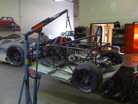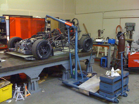 To make sure the solution also works with the prototype I had to create a separate folder with the full CAD of the prototype as it sits. Digging back into the archives from September it was interesting to see how much progress had taken place. The changes are subtle but significant. And numerous. 1/25/10 Updating the prototype with the new floor mounting scheme, we had to access the car from below. The initial plan was to lift one side up with the engine hoist. So Tristan put wheels on one side, started lifting the other by hand as a test, then just kept going and put it up on the side.
