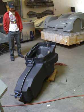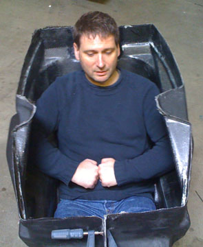 The parts still need to be trimmed and then we'll see how well all this fits into the frame. The intent is to use 'bead seat' kits inside the Pod to tailor it to individual drivers. I'm quite pleased with how the elbow pockets worked out - there is plenty of room but still good shoulder and upper body support. Even the dead pedal notch seems to be in the right place and the flat sides of the footwell are very nice for bracing one's knees - no more bruises! Once the Pilot Pod is in the car I'll have a number of different size people sit in it. Fits me just fine :) 03/19/10 The fitting of the Pilot Pod into the prototype took a bit more effort than hoped for. Some of it is not entirely unexpected, since the Pod was designed for the production frame and the prototype frame is different in many ways. Other things we ended up needing to change after actually sitting in the car. Not a huge deal since the first Pod was made in a quick temporary mold (hence the somewhat rough appearance) but now we're incorporating the changes into the production tooling.