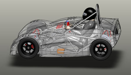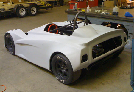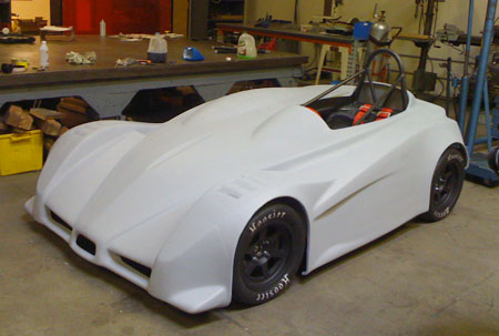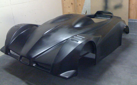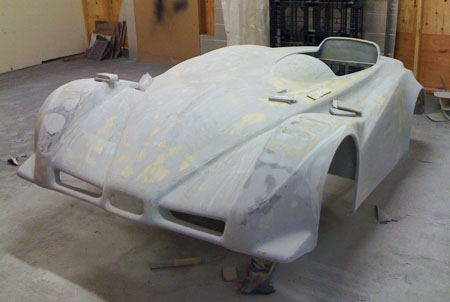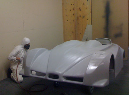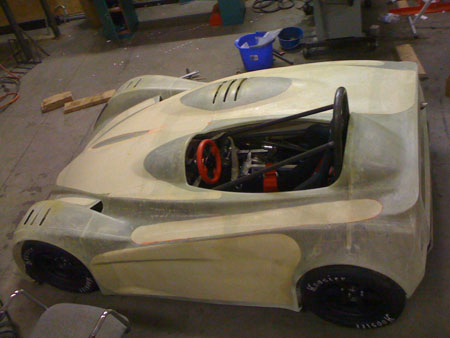 This isn't just a prototype - it's a fully documented design, with a sourced and costed multilevel BOM (including every bolt and washer) and tracked inventory. There are now 505 Solidworks parts, 159 assemblies and 162 dimensioned and toleranced drawing pages. For those wondering what it takes to live the dream, this should give you some idea :) A few things remain to be ironed out but I feel comfortable quoting customers 90 day delivery times for the dp4. Reflecting on what it took to get to this point - Tristan has basically fabricated the entire car, from building the frame and suspension arms to assembly, some fiberglass fabrication and now paint. M did purchasing, accounting, BOMs and inventory (she also organizes and runs our trackdays). I did the design, CAD work, vendor selection, expediting, management and whatever else needed to keep things going including a number of consulting projects, Atom upgrades, etc. I've seen companies with 10x the people and 20x the resources deliver a lot less in a similar timeframe. So by that measure we're doing quite well but many challenges remain. 04/25/10 For the last week Tristan has been doing prep on the body. In production the surface finish out of the mold will be much better but this one is requiring a lot of effort. It'll look very nice when done. Here is what it looked like with the first coat of high-fill primer: