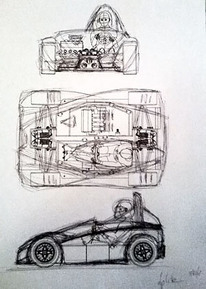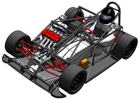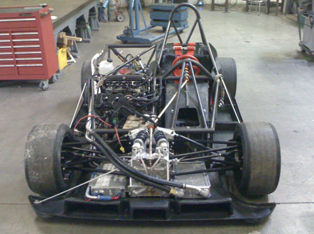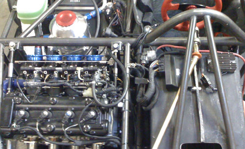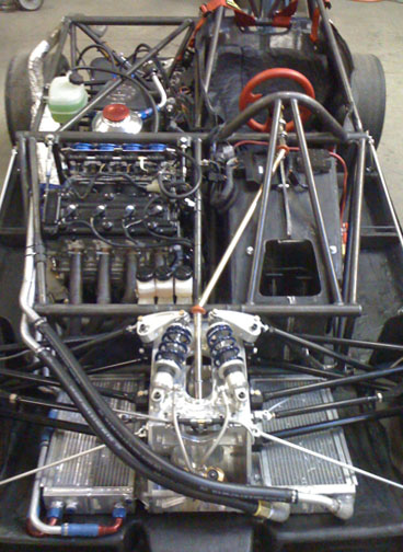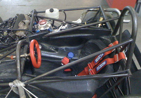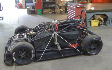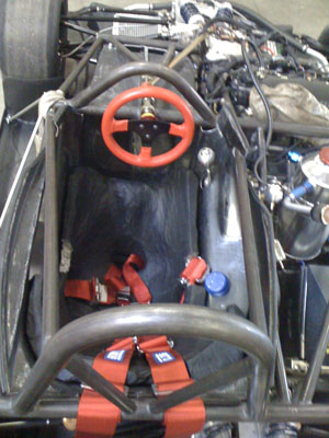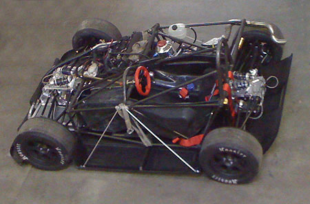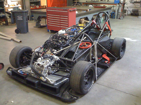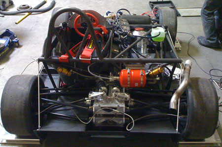 A nice benefit of the engine's proximity is that I can use the original bike harness without splicing into it. All I did was remove the unused wires and connectors and added some anti-abrasion shielding but other than that the harness is 'stock'. Could even use the stock dash from the literbikes (Hayabusa one is too big for the dp4). The car is drivable again. I fired it up and all seems well. Bodywork is being prepped for paint right now, we're thinking flat black with vinyl graphics for this one. We've come quite a ways in the last year and a half. This is what the dp4 looked like on September 21, 2008: