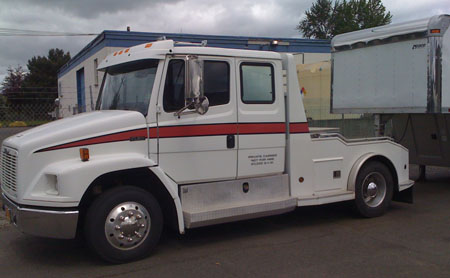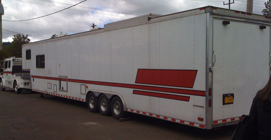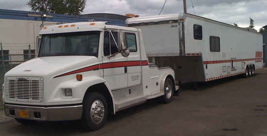 This is where the composites room really pays off since all the sanding really makes a mess. I'm eager to see what the car will look like painted. I think we'll go with satin black paint and vinyl decals, but it's not final yet. 05/04/10 The main focus of my efforts is making very small (but powerful) cars. So it is particularly unusual that I have some BIG news to announce. An opportunity came up to acquire a racecar transporter rig - and so we did. It all started when last thursday Tristan emailed me a link saying 'hey, you should get that!' - mostly in jest. And then he went camping for the weekend. Imagine his surprise when upon his return monday we all went to look it over (second time for M and I) and closed the deal on the spot. Some things just feel right and this was one of them.