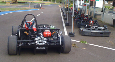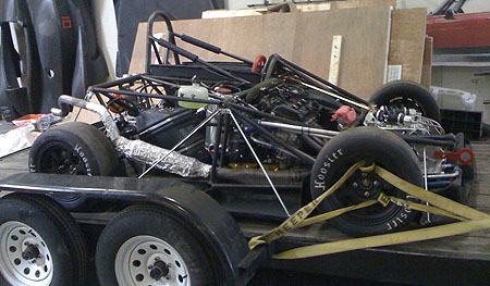 Once it dries we'll see how it looks on the car. For the moment, we'll use quarter-turn fasteners to retain the bodywork and hood pins as safety backup. The production solution will present itself in due time and will most likely be an evolution of this arrangement. Speaking of production, we're now in the process of building two customer cars. Things are moving. 05/07/10 Yesterday we finally got a break in both weather and schedule enough for a quick kart track test at Pat's Acres. With the floor on and its attendant 1" ground clearance it's a bit more of an effort to load the car on the trailer but we figured it out pretty quickly.