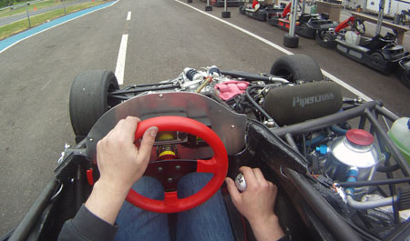 Both M and I got to try out our respective bead seats. They ROCK. I can actually relax in the car and let the seat support me instead of trying to wedge myself in there against g forces. Swapping the seats out is straightforward and the new belts work very well. It is in fact possible to put on and adjust the belts without outside assistance, which was one of the goals for this design. The test went well overall although it did show that we still have work to do on chain guides/adjusters. It seems that under power the chain does a wilder dance than I anticipated. Fortunately I have a contingency for it and parts are already made, we just need to install them and test the result. This outing was also a test of our new GoPro HD camera. This thing is cool. It's obvious that it was developed by someone who actually uses a camera for sports video and a good deal of thought went into both the camera and the overall package. You get a lot for the money - just a couple years ago I paid more than this just for a waterproof case for a point-and-shoot I used to have. The GoPro is a huge leap over everything I've used before both in quality of video/audio and in terms of convenience.