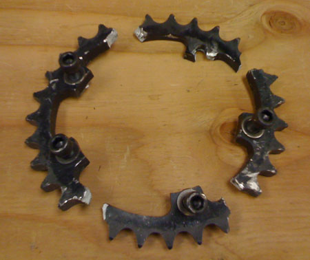The camera comes with a variety of mounts which can be permanently attached to things and the camera itself can then be quickly moved by clipping it into whatever mount you choose. I decided to run it as helmet cam this time, using the 720p/60fps setting. it'll do 1080p also but at 30fps. It kind of works as an exterior shot camera too although aiming it is a bit of a guessing game, a steady hand is called for and the lens is a bit too wide-angle for faraway stuff. But in a pinch it does fine. Since my old editing software doesn't work with MP4 files I downloaded a trial version of Vegas Video from SONY - works pretty well. Of course I didn't spend any time on the edit other than to splice a few clips together so take it as such. The file is BIG (131M) since I wanted to keep the HD resolution. Click on the picture below to view, or better right-click and 'save as' to download. 05/19/10 We've been doing some testing lately at Pat's acres. The weather has been weird - dry for a couple hours in the morning, even sunshine (like today) then downpour starting at 11 am or so. We get out to the track, run a couple laps in the dry and then the rain starts. It's just as well though, since we're presently learning a lot about the chain setup. On the original dp1 prototype I went a bit overkill with the chain containment so on this proto I've started at the simple end and am now working up. Up until today, under full power the chain would move around too much and start hitting things so we've tested a couple solutions with varying success. After yesterday's test we finally came up with a setup that we felt would take full power - and we were right! Today I was able to get on the throttle early and stay on it for most of the straight. The car is a BLAST :) But of course other challenges arose. The kart track has a series of bumps about 2/3 of the way down the straight. I was now hitting those at over 80mph, still in 1st, full power and edging up on the rev limiter. Even on a perfectly smooth track this is the most load that the chains would ever see. Now add the bumps and you'd be hard pressed to come up with a more severe test. The car handled it for 4 laps, then on the 5th one BANG! - followed by grinding noises. Peeking inside, the problem is obvious: a sprocket disintegrated.