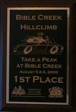 8/5/00-8/6/00 Bible Creek Hillclimb in Central Oregon. A long, hot (95F) drive from Portland. First day problems with timing equipment delay start from 9:30 AM to 1:30 PM. Only get one run and go back to the B&B, exhausted from a day of waiting around in the sun. Sunday things run smoother, although another timing equipment malfunction means i get an extra run, as they don't get a time for my first one. About mid-day an MR2 goes off into the trees. The driver is OK, the car looks totalled. A tree stopped him from plunging a couple hundred feet down the cliff. My last run for the day I am a bit more conservative, but still get a better time. Good enough for a resounding class win, and third-fastest on the hill (behind two formula cars with wings and race slicks). A 400+ hp Camaro came close to my time after a remarkable 10-second improvement, but still fell short 0.2 seconds of my best effort.