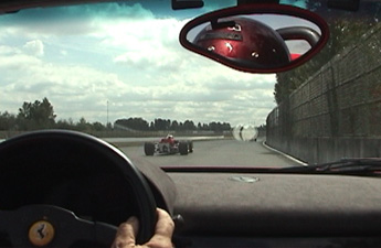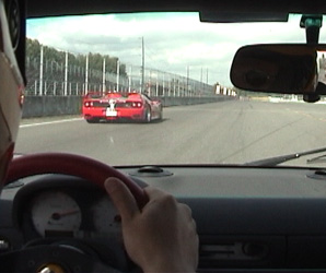 8/16/01 BMW club day. The car is just not running right. It's smooth, but power is noticeably down. Could only manage a best of 1:34 with the chicane, which is not great. My driving wasn't all that spectacular either - a clumsy downshift had me scrambling to find my way through the chicane (video here). I wasn't the only one having trouble staying on track, and unfortunately the gentleman in the M roadster that you see in the picture above was not as lucky as I, ending up on top of a tire wall, with the nose pointing up at the sky. Luckily he was not hurt, and his car was even driveable afterwards - but only barely. Video here. Hmmm... I need to be improving, not regressing. Hopefully will do some of that on Lotus day August 31st. So far the 'upgrade' of exhaust and ECU has proven to be less than effective. Did a couple runs with G-Tech accelerometer, and the results are disappointing - 5.3 sec 0-60 and 13.88 quarter mile at 104 mph. A far cry from the factory advertised numbers for a stock 190. So, almost $3,000 for a 3-4 second per lap loss? Sign me up for more :( 8/31/01 Lotus club day at PIR. Lotus days are the best - TONS of track time and much more relaxed than others. I got seven 20-minute sessions and went through more than 2 tanks of gas. It's the only club where I get to share the track with some really cool race cars, including a lot of vintage Lotus open-wheelers. I also sent my camera for a ride in the F50 (having ridden in it myself already there was no need for a repeat).