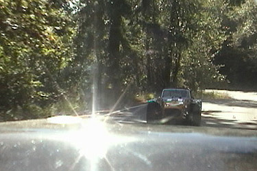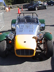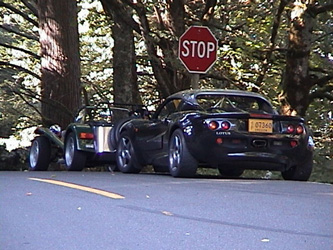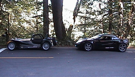 I've put together a video from the Ferrari and me following him through a section of the track. He was being rather conservative and running about the same lap times as myself, maybe a second faster. But his power and speed on the straights are in a totally different league from the Elise. Ah yes, $500K+ still buys you something ;) The tuning I've done to the Lotus has helped a bit, but the net result is now the car is essentially back to where it was before I started the mods, performance-wise. Yes, it is more pleasant on the street, but I hardly ever drive it there. On the track there's no improvement. Oh well. 9/7/01 Needed to take a break from work to clear my head - what better way than with a Lotus outing. Didn't take long to convince a friend to bring his Caterham (a Lotus 7, basically - similar to my just-arrived Westfield kit). We headed out to some nice roads nearby, and brought a video camera - below is a clip of our idea of what should be done with a Friday afternoon... And of course we stopped a couple places to snap a few stills of the Loti at rest.