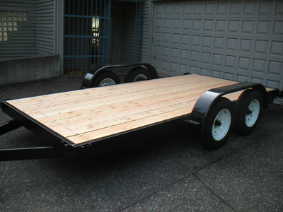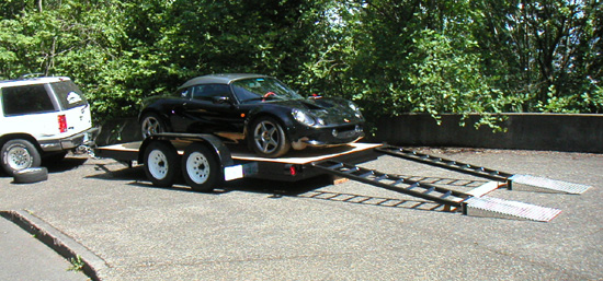 I also upgraded to stainless steel brake lines at all four corners. Bleeding the brakes is proving quite time consuming, and I still have air in there somewhere after a couple of hours of trying. Overall, the front bushings and all the brake lines took two days, at 8 hours per side. Went for a quick test drive, and the difference is quite notiecable. The car really should have come this way from the factory! The steering response is much more precise and immediate. Some of the clunking noises are gone from the suspension, and overall the ride seems smoother and more controlled. Definitely worth the effort. Now I need to find the time to install the new ultra-close ratio gearbox, upgraded clutch and throttle cable. I thought that building the Westfield would satisfy my tinkering urge and let me leave the Elise alone. The result has been quite the opposite - I'm now more comfortable with making modifications, and the feel of the Westie showed me what's possible, so the Elise now felt slow and heavy in comparison and had to be upgraded. Sigh... 7/6/02-7/9/02 A long trip to a two-day TracQuest event at Thunderhill, in northern California. Since the event is 500 miles from Portland I had decided to trailer the Elise. The problem was that I had neither a trailer nor a vehicle to pull it with. After much unsuccessful searching for anything to rent or buy, with only a week to go I found a company that could build a custom open trailer by the 5th (I had to leave on the 6th in the morning). A friend offered the use of his Jeep as a tow vehicle and decided to come along in his supercharged Miata and drive in the event, as well as be there should anything happen with the Jeep. So everything was set... or so I thought. On the 3rd I confirmed that the trailer would be ready on time, and picked up the paperwork so I could register it on the 5th in the morning (the 4th being a holiday). The Jeep still needed a hitch attached, and the installation is going very slowly due to rusted out bolts. The forecast for California is 99F(37C) on Sunday and 101F(38C) on Monday. The Jeep does not have air conditioning. Hmmm... Friday I obtain registration for the trailer and confirm the appointment to pick it up at 3 pm. At 2 pm the hitch is still not on the Jeep but is really close. There is no wiring for the trailer and left turn signal doesn't work. My friend's Miata needs much work which wasn't getting done because of the Jeep, and its air conditioning is not working either. I call another friend with an SUV to help me pick up the trailer. He's gracious enough to come out on a moment's notice, and the trailer is transported to my driveway without incident. Looks cool.