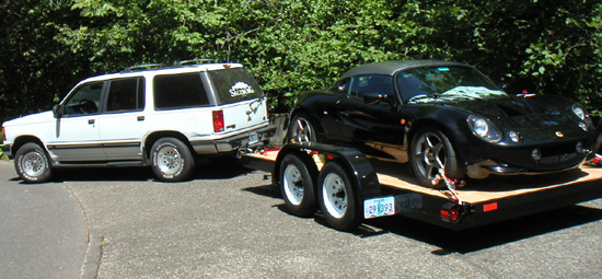 The SUV, a Ford Explorer, is fully wired for the trailer, with a nifty electric brake controller and AC that works (somewhat). I really wish that I could borrow the Ford instead... And after relaying my predicament I am indeed offered the use of the car. I don't hesitate long :) I offer the use of my M Coupe while I have the SUV, and my friend doesn't hesitate much either. Cool, it works for everyone then. The downside is that since the Jeep is not going and the Miata is without AC, my would-be travel companion opts out and I'm left to face the long drive alone. I had even bought two-way radios... Oh well. Saturday morning I pack everything up, load the Elise on the trailer, sit down for a minute to make sure I got everything, and head out.