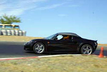 About 50 miles into the journey I realize that I forgot the bag containing the video camera. Not a big deal. The miles and the hours roll on, and after about 5 hours I get a nagging feeling that I left the power switch on in the Lotus. That could completely drain the battery - so I pull over and go to check it... only to realize that the key to the car was in the camera bag, which was now 300 miles to the north! It is a sick feeling. After calling a couple people to vent (and get sympathy) I decide to continue on and figure something out when I get there. Another 4 hours through some spectacular mountains in southern Oregon and northern California and I finally arrive at the hotel. Upon checking in, I open the tool bag trying to figure out what I can use to get into the Elise... and at the bottom of it find another key! Whew... Good to bring a spare, even if you don't know it. Sunday morning I drive over to the track and unload the car. The Elise is the most exotic thing there (although there are both faster and more expensive cars, primarily Porsches of every flavor). A former fellow M Coupe owner from the bay area is there as an instructor (I had previously met him at Sears Point last year). He offers the use of his video camera and lap timer. Cool. Things are definitely looking better. Although I had run on the track before almost exactly a year ago (see M Coupe entry for 7/10/01, about middle of page 1) I started out conservatively, with lap times in the 2:25 range or about equal to the fastest I've gone there in the BMW. As the day progressed I picked up speed, getting into the 2:15 range by the final session. I only videotaped a couple of sessions, and between runs downloaded video of a 2:17 lap (17M) into my laptop that I brought along. Compare it with the one for the BMW (18M) and you can see that in the Lotus I'm moving a bit faster :) Granted I had driven the Coupe to the track but trailered the Elise.... After a full day at the track and a much needed shower, a banquet hosted by the event organizer. The feast is included in the price of the track day and the food (and wine) are very good. As are the catered lunches at the track for both days, for that matter.