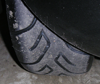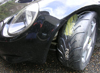 A couple of days ago I had put the 'street' wheels on the car and swapped the 038s for 048s. Today, seeing a break in the rain I decided to put the new 'race' set on. Of course just as I rolled the car out of the garage to change the wheels it started to rain again. Oh well, it needed a wash anyway. So the new rubber is now on, the Elise is clean and shiny and the Alfa track day is less than three weeks away. Hope the weather cooperates - otherwise the Mini will get to run that one. I'm eager to see how the 048s perform. They are not really available in S1 Elise sizes yet, this is a somewhat 'experimental' set - it helps to have connections ;) 03/02/04 Took the Elise out today for a quick warm-up and to get an initial impression of the new 048 tires. The new rubber is pretty cool. First thing I noticed is that the steering is a LOT lighter than with 038s. This is mostly due to the really rounded profile, which combined with the massive camber I'm running puts only a portion of the tread on the road. Even with that on my favorite twisty road they stuck really well. Being brand new Ididn't push the tires too hard but soon found myself going at speeds higher than what would have had the old heat-hardened 038s stepping out. This didn't even stress the new tires enough to scrub the rounded shoulders in, leaving about 2" of virgin rubber on the sides. I used 24 psi all around.