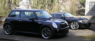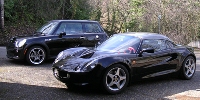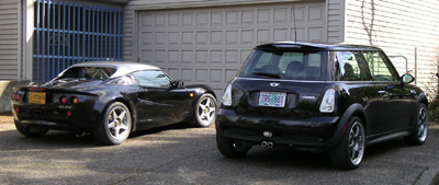 It will be interesting to see how they do on the track and I hope to find out on the 13th if it doesn't rain. Also depending on how the tires work once pushed I may back off the camber a bit. Next on the agenda are new sparkplugs, new oil/filter, cleaning of air filter and a no-rain dance directed at PIR weather gods. With the Elise sitting next to the Mini I couldn't resist some gratuitous pics...