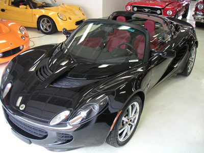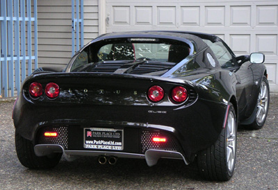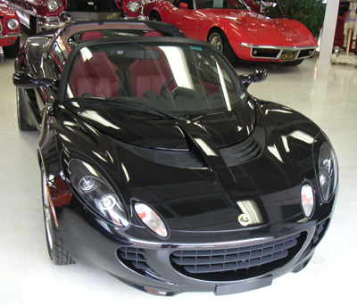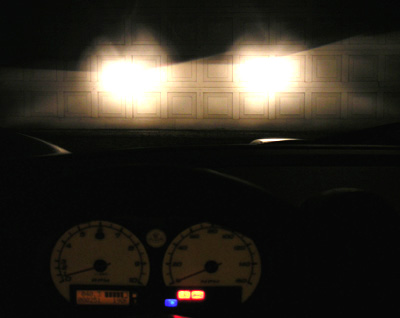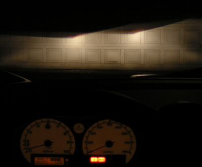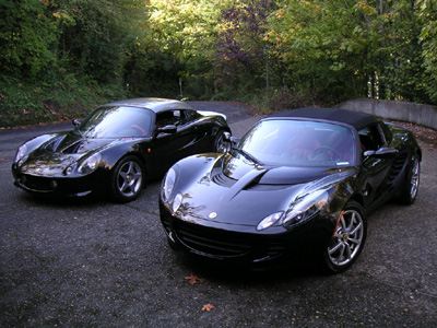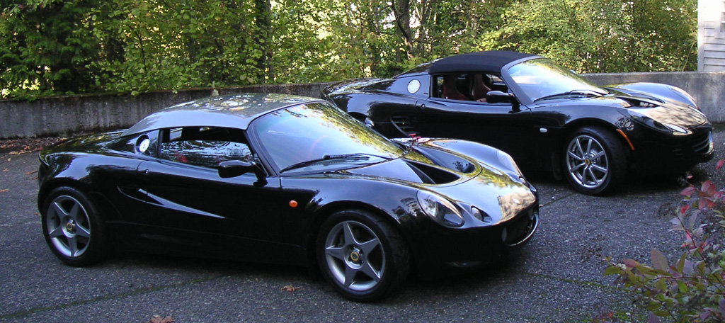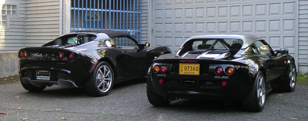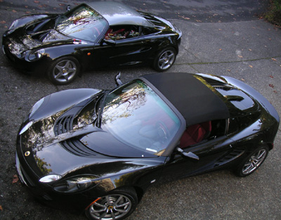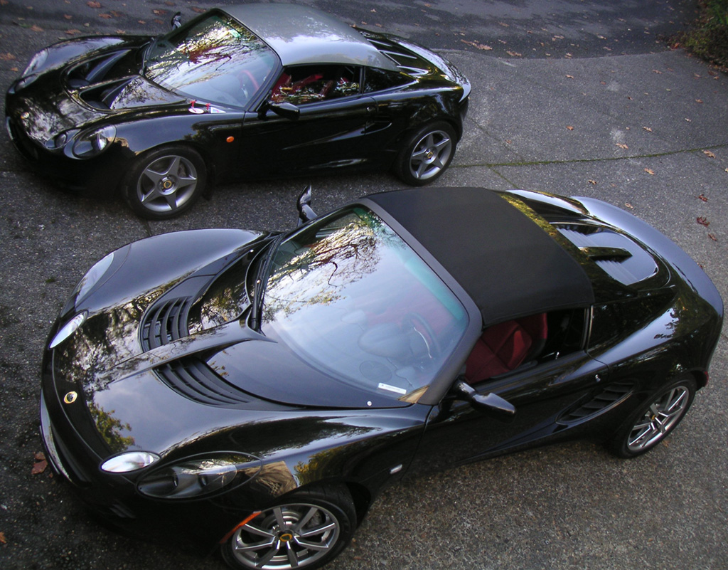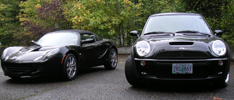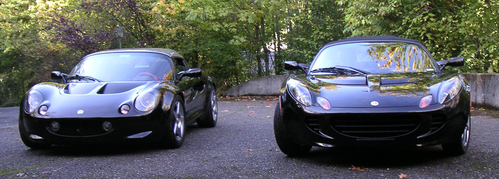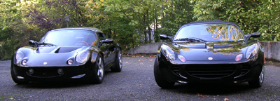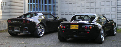 Yes, that's right, a Federally-mandated interior trunk release handle. Keep in mind that the trunk is barely big enough for a duffle bag. But if you were to accidentally lock a gnome in your Elise's trunk he'd be able to escape! No wonder it costs millions to make cars street legal in this country. Again, my hat is off to Lotus. That's a very nice trunk release handle! 10/10/04 Yesterday yanked out the stereo (less likely to attract a break-in and no silly blue light in dash). Also the trunk interior release handle, cute as it was, is now history because it looked like it was a source of a rattle. The 'lis also got its first coat of wax and while I was moving cars around I took a couple of shots with it next to the MINI (click on each picture for larger version). Then today, my friend stopped by with my 'ex' Elise for a side-by-side comparison. Only took photos today but in the near future the plan is to do a comparo drive on some twisty roads. Obviously I'll post the results. In the meantime, here are some pix (clickable). The new car appears wider due to front fender shape. It also sits nearly two inches higher - something that will get fixed in a little while. Overall impression is that of a larger car even though it isn't. 10/11/04 Went for a nice 50-mile drive on winding country roads at night. First thing I noticed about night driving in the Elise is the weird headlight pattern. It's like two checkmarks, with rainbows up top, aimed relatively high (my driveway slopes down a bit so it's really not as severe as the pictures show but still higher than I'm used to).