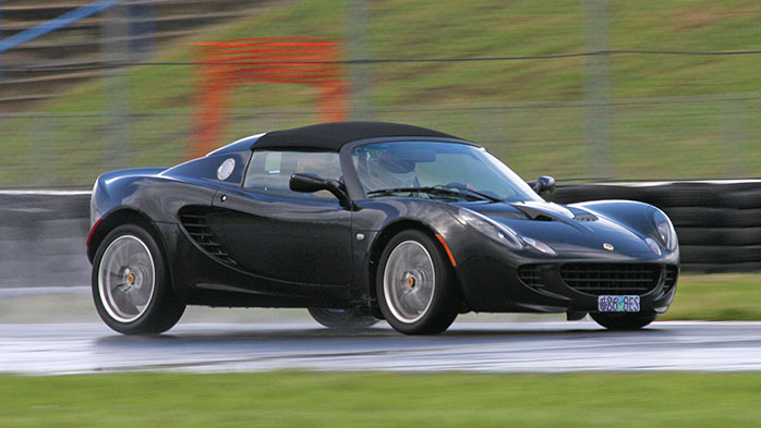 Yes, a change it is. The Box is great at playing the underdog and embarassing the hell out of bewinged Porsches in the corners, but the Lotus is not an underdog. It fights valiantly for the lead in the pack. I had much fun chasing foes like a modified Boxster S, a supercharged NSX, et al. Street tires vs their R compounds, no matter. Full 15 seconds per lap faster than the Scion. This pace is equal to a Lotus 23 on slicks. Except this is a street car on street rubber, OEM brake pads and stock (not even 'sport') suspension. As many shortcomings as the 'Lis may have as a street car, on the track it just shines. Even in the rain, for a quarter session. And the heel-and-toe pad really works, too. More please. 05/20/05 A rather wet Porsche club trackday. In preparation for it yesterday I changed the front brake pads. The OEM pads had lasted 6 trackdays and worked extremely well so I got same for replacement from the dealer. They're made by AP Racing. A bit steep at $189 for just the fronts, but they do come with all new pins, clips and even adhesive anti-squeal backing. Another one of those deals where at least you feel you're getting something for the money :) The change procedure is very painless, too, taking only about 5 minutes per side. The morning started with rain. In fact the first instructor session was run in torrential downpour. The Elise and its Goodyear shoes handled it as well as could be asked for and it was actually good to break the new pads in a bit gentler than a full-on session.