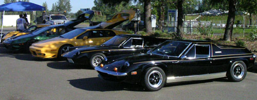 The second and third sessions were mostly dry, followed by another rain-soaked one. At one point I decided it would be a good idea to 'dry' a puddle in the middle of turn 10 by splashing through it. I took the appropriate line and the splash itself went without incident, but it got the tires wet... Fortunately I was expecting SOMETHING to happen so I was ready and it was almost a non-event, as the short video demonstrates. One funny thing about the clip is that I had accidentally disconnected the microphone and so there was no sound. I just found an earlier clip and pasted the sound from it. Came out OK I think. Hollywood, here I come! :) Another moment came when I was showing a student lift-throttle oversteer in 12. Another save, right there for the spectators. I was hoping someone would capture the moment on camera but no such luck. Ah well. A fun day, definitely. UPDATE: While nobody got a pic of my sliding around, Dave Birkbeck did get a nice one of turn 12 entry in the rain... 05/27/05 Lotus club trackday - the fourth track outing for me this week, and a very satisfying one. Lotus days are known for the coolest machines showing up and the most tracktime. Today was no exception. 170 track miles, two tanks of gas, lots of fun. The usual mix of Loti, vintage racers and regular performance machinery was onhand.