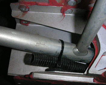 The hole on the left is the new one and makes the bar similar to what came with the Sport 190. We'll see how well this works. While messing around the front suspension I may have finally discovered what was making the buzz I've been chasing so long. There is a hard plastic drain tube (I'm assuming for A/C condenser) that comes out by the passenger side wishbone. The thing was loose against the chassis and definitely prone to rattle and buzz. I put a piece of foam under it and then secured the tube to the wishbone.