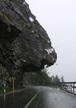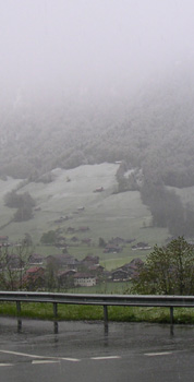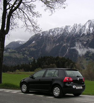 uneasy sleep on a 10-hour flight. Getting to Geneva at the Hertz counter I'm informed that they don't have any MINIs. Damn. I'm offered a Golf but resist. They keep checking and offer me a Megane which I accept but then they say it's not available. Ditto for a Focus. So basically after half an hour of polite smiles and broken English, Golf it is. I recalled reading that the newest generation Golf was supposed to be better than the previous one, getting back to some of the fun-to-drive values. Uhmmm, yeah.... The thing feels like driving a huge pillow, with the anemic 1.6L engine buzzing away hopelessly to motivate its substantial heft. To its credit the Golf is solid and rattle-free, in an overdamped kind of way. It has a 6-speed but the ratios are so tall that 5th and 6th are only usable for economy cruise on flat sections of freeway. I'm afraid this is not going to be fun on the 'Ring. That said, on the way up the mountain to Leysin I actually manage to pass several cars but it's a real adventure trying to pull off each maneuver. This is a great car for people who don't really like to drive. Tomorrow I'm going to check if it's possible to swap the Golf out for something else - I'd gladly drive the 1.5 hours each way to Geneva to do it. At least the drive is scenic. Except that it's been raining since my arrival...