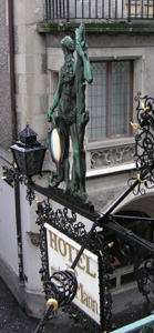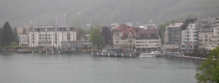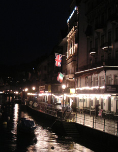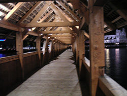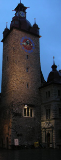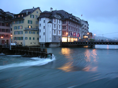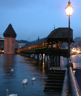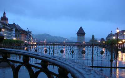 Then, over the short but steep pass between Interlaken and Lucerne, I encounter snow. A sprinkling at first, then a couple hundred feet higher in elevation the road is covered. The Golf actually does quite well in this and is starting to grow on me. The trick is to keep the RPM way up and to brake very late for turns. Amazingly, a guy ahead of me is going over the snowy pass on a motorcycle - albeit rather slowly. Arriving in Lucerne the traffic is terrible. The main streets are completely clogged and so are side streets feeding into them. To make matters worse, a lot the streets are one-way. It takes me a good hour of circling to finally find a parking garage near where the hotel is supposed to be. I then locate the hotel on foot. The hotel is situated right in the center (the fact responsible for the difficulty of locating it). Parking in the garage is expensive and I'm told there is no street parking. Yet I see cars parked on the street one block away and no meter signs. So I decide to chance it - successfully, as it turns out (and again the next night). Sometimes it pays not to take people's word for things. Once checked in, a couple hours walking around the dark, cold, rainy city. It's a picturesque place and nice to just walk around. I only wish the weather weren't so miserable.