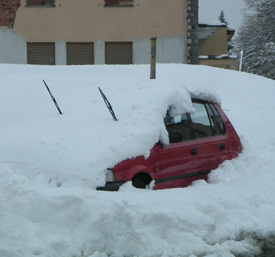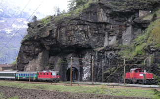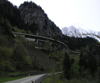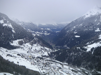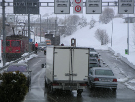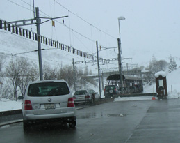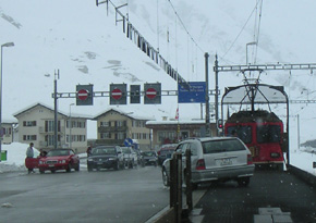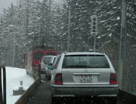 So, reluctantly, it's back down through the tunnel, this time taking the turnoff at the other end to try and get to the roads this way. An electronic sign shows most of the passes closed but a couple open so I decide to try and see what's there. After a half-hour drive through ever heavier snow and fog, I pass a train running alongside the road and then pull into a town - where the road stops. It turns out the way to go forward is by 'car train', that carries cars over the pass. Sounds interesting. I buy the ticket, wait about twenty minutes, then drive onto the train. As it pulls away from the station it's a weird feeling to be sitting behind the wheel of a moving car, as a passenger. I was hoping for some cool scenery but unfortunately just half mile from the station the train pulls into a tunnel where it stays for the whole trip.