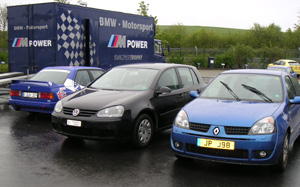 Then back in the Golf, scooting along the winding coastal road through the ever-present rain all the way back to Lucerne. Tomorrow is the drive to Nurburgring, where I'm once again meeting Ed, so I try to get some rest. I fail... Day 4. The Ring. This is becoming an annual pilgrimage - not a bad tradition to have. The drive up from Lucerne is uneventful and I find a rest stop where I catch a couple hours uneasy sleep in the car. I now feel a bit better. Steady rain is punctuated by a single ray of sunshine just before the German border. The sun brings a glimmer of hope for better weather up north, which is soon washed away by the return of steady downpour. Oh well. I fill up, feeding the Golf some premium fuel in hopes the CPU would recognize it and squeeze another horsepower or two out of the motor. It does seem to respond to the way I've been driving it in the mountains for the last 500 kilometers and the car feels a bit more lively now. Or maybe I'm just getting used to it. Also I pump up the tires from 2 to 2.75 bar. Once into Germany I put the right foot down and find out that the Golf tops out at 190 kph in sixth gear and 200kph (125mph) in fifth. The speed is quite entertaining in the rain and I maintain it for quite some time, burning a ton of fuel in the process. My arrival at the Ring is greeted with a drizzle that quickly turns to downpour. Ed is already there and out on the track. I buy a 6-lap pass, catch a two-lap ride with Ed to refresh my memory of the course and then do a couple laps following him. Ed's current ride is a hot version of Renault Clio, a 'hot hatch' similar in spirit and performance to my MINI.