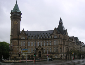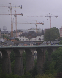 In the dry he'd be a whole lot faster than me in the Golf, but in the wet the disparity is not as ridiculous. Still, he has to hold it back some so as not to lose me on the lead-around laps. I do seem to have some memory of the track from a year ago. I still can't sit down and picture the whole thing but when I see a turn I can generally recall what comes next. Most of the time. This helps me maintain a reasonable pace. I pass a 944, then a Maserati cabrio, then a whole string of Porsches, BMWs and Audis running in a group. Only five people pass me the whole time I'm there (8 laps total, 6 initial ones and two more later) - Ed, of course, then a Smart Roadster in its hardtop configuration (reportedly driven by a pro test driver), then a silver late-model 911, then an A3 Audi. One of the later laps, a 993 C4 starts out right behind me. I lose him for a while, then on the long uphill section he gains on me but not enough to close. He edges closer on the straights and I pull away in the corners. The Golf is doing quite well then, despite its wimpy 1.6L motor and all-season tires (though strangely the motor that used to buzz now seems to almost growl a bit? must like the premium fuel). The stability control is particularly impressive. I 'discover' the technique of going into a corner hopelessly fast, resulting in an instant of understeer, at which point the electronics take over and neatly bring the tail about - to match what the steering wheel is attempting to do. Pretty cool (by contrast a MINI simply provides enough control to let the driver do the same thing - assuming he has the ability that is). Given the circumstances I'm not complaining though. The Porsche does catch me on the final straight and I let him pass just before we slow for the exit. Next lap I let him go ahead and hang on his tail until the lengthy uphill where his horsepower advantage can't be overcome, premium fuel or not. I do keep him in sight for most of the lap and when I enter the final straight he's about halfway down. That means he gained about 20 seconds on me out of a roughly 12 minute lap. At this point I'm rather happy with the rent-a-Golf and pat it on the steering wheel as we pull in, thanking it for a job well done. A video clip here. Then, onwards to Luxembourg. The hotel I'm staying in is very nice and will serve as a base for my exploration for the next couple of days. Much better than the one I stayed at last year - neater, better located and cheaper too. Checking in is a major dejavu moment - I could swear I saw this whole sequence in a dream during my Euro trip last year. At the time it made no sense which is why I remember it (or I think I do anyway). Weird.