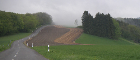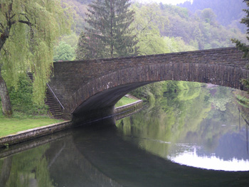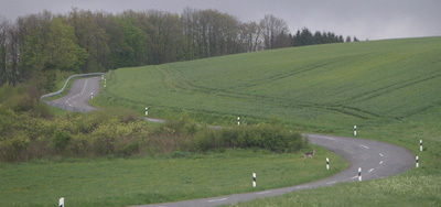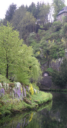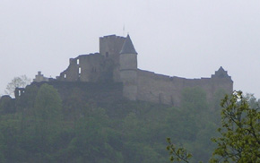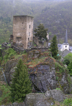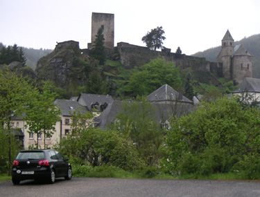 Speed limits are 50kph through towns but 'unlimited' elsewhere - I suspect there is a default speed limit of probably 100kph or so. At any rate 100-120kph is as fast as I'd want to go here anyway, especially in the rain. Giving up on the Frommer's I resort to my usual methods and head north to interesting-looking twisty pavement. Ahhh, that's more like it. The road winds its way from Diekirch towards Eche-Sure along a stream, sometimes climbing high above it and then coming back down. Surface is usually immaculate but there are some rough stretches where Golf's solid structure and supple suspension prove to be an asset. I happen upon a feisty Renault to play with and we tear along the wet curves at a good clip. There is hardly any other traffic. I see a number of neat castles along the way and stop to take a couple of pictures.