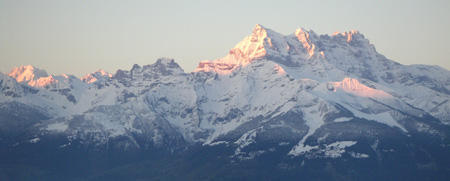 I miss a couple of the intended turnoffs but manage to maintain a general direction and finally, after passing through snow-covered mountains and countless rain-soaked valleys I enter Switzerland. Then it's an easy fast cruise to Aigle and a spirited sprint up the mountain to Leysin. Early in the climb I catch up to two cars that despite being slower than my desired pace are still making good progress so I stick behind them and the three of us ascend all the way nose-to-tail, thankfully unimpeded by any other traffic. Mildly entertaining, which is all I could ask. Then, time to relax a bit. Day 7. Monday, the final full day here. Thankfully the rain has decided to give me a break and I wake up to rising sun coloring the tops of the peaks outside the window.