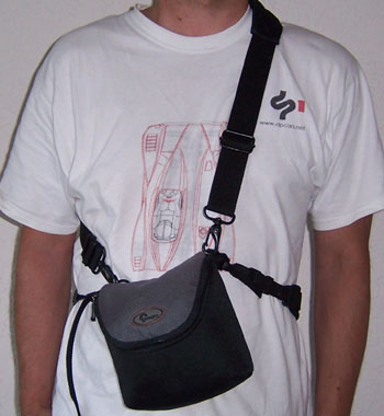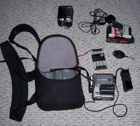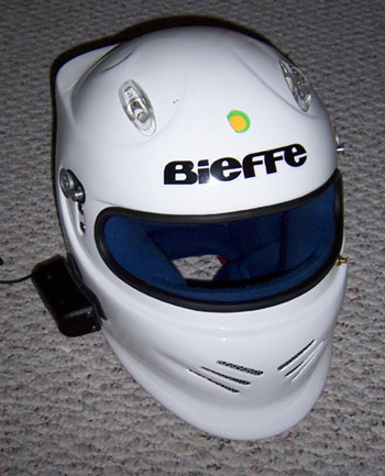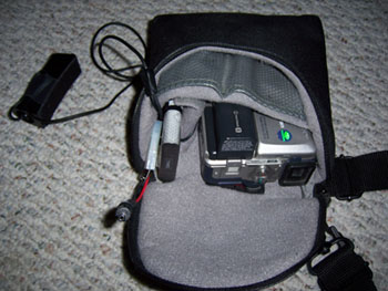 Helmet camera: For a lot of the videos I use a helmet-mounted camera from ChaseCam. I used to have a camera from another vendor but when it died I got the higher-resolution one that I use now. I still attach it with the previous mount, just because I like the chunky billet-machined feel of it. The camera requires a camcorder with a composite input and my trusty Sony DCR-PC5 Mini DV serves in that role. It's compact, reliable and fairly easy to use. Power for the helmet cam is provided by a Radio Shack 9.6V RC car battery. Works great and is cheap and available. The camera itself can be mounted in many ways. I got a few different mounts from ChaseCam but haven't gotten around to trying them yet. This is mostly because I find that helmet mount is the most interesting and natural way to capture video as it gives the driver's view and the camera pans with head movement when I look through turns. The entire package is housed in a camera bag that I got at a local camera store. The microphone is also in the bag. It all looks like this in use: