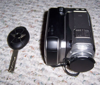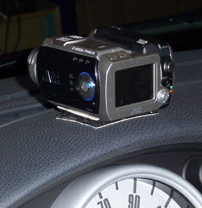 The camera is attached to the helmet with 3M Dualock industrial 'velcro'. I use the stuff for a lot of purposes, it can be purchased online from McMaster Carr (item number 96055K43, about $2/foot). While on the subject of attachment means, another favorite item is 'Gaffer Tape'. It's available online from a variety of vendors and comes in many grades and colors. I usually get it from FindTape. What's great about it is that it leaves none of the nasty residue that regular duct tape does. Just peels off, nice and clean. Well worth the extra cost over hardware-store stuff. The resulting setup is nice in that it's completely self-contained and I can wear it in any vehicle - cars, motorcycles and even aerobatic airplanes. Yes, it's been successfully tested to +6.5/-1.5g vertical in an airplane, +/-2g lateral in a DSR, and 175 mph on a motorcycle :) There is no need to worry about finding a place to mount the camera and the camcorder, or routing wires. Once the velcro is on the helmet you just always stick the camera in the same place and you know the field of view will be consistent. Another benefit is that the camcorder is totally isolated from any vibration. All of this definitely makes helmetcam the rig of choice when I drive or ride in other people's vehicles or those without easy mounting means, such as the kart. Just get in and go, no hassle. The shoulder strap carries the bag and the elastic waist strap keeps it from flopping around. There are some drawbacks to using it however. First, while being reasonably compact, it can still be a bit awkward and get in the way. On motorcycles I shift the bag to my back but if I were to crash with it there (which thankfully I haven't, yet) I think there could be some potential damage to both the camera and myself. After my recent 748 crash I was reminded that it can in fact happen so I don't think I'll be using this on motorcycles anymore. The other issue is that to start recording requires a bit of messing with it - plugging in the battery connector to start power to the camera, turning on the camcorder, going through menus to get to the VCR function and then starting it. Because of this it needs to be done before going out to pre-grid and without gloves on. Which isn't a problem if the session is started promptly but sometimes we end up sitting there for 5-10 minutes and all the while it's burning through batteries and tape. The camcorder battery and tape both last about an hour, good for three 20-minute sessions. Any significant delays can really cut into that. JVC Everio MC-200. There is a trend for new cameras to go solid state and record directly in MPEG2 and this is one of the first full-resolution (720x480) 30fps cameras of this type. I got it hoping it would be small enough to mount directly to the helmet but unfortunately it isn't. Instead, I mount it with the Dualock stuff to the dash. I'll also experiment with some mounts I got from ChaseCam to try and mount it on motorcycles instead of using the helmet cam. First setup I tried on the PS was not very satisfactory (too much shaking) but there are a few others I can use. Watch the bike pages for updates on that.