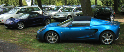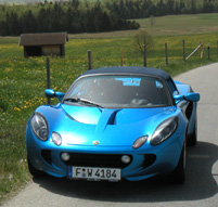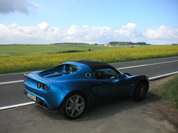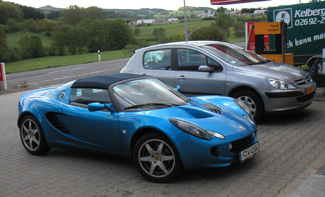 The Elise I got is a brand new one (2,500 kilometers). Still smelling of curing fiberglass, like mine did for the first year. The paint is a light metallic blue with 'race tech' package in the interior. Not the best color for it I must say, although I got used to it as the day wore on. It even looked quite nice among fields of yellow dandelions along the way.