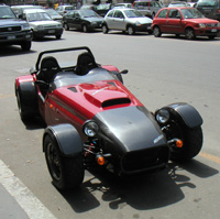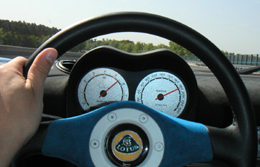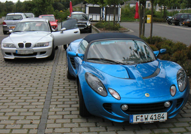 First impressions of the car - it feels wider than mine. I think this is because the sharper creased fenders stick out more in the field of vision. Ride quality is about the same as my S190 and in fact I think my car handles sharp pavement imperfections better. This is surprising because my car is supposed to be the 'race' version. Another note is that I prefer the old interior to the new one. It was more interesting and functional. Other little items - the rearview mirror vibrates like mad. The shiny radio antenna on the engine lid reflects the sun and keeps flashing in the vibrating mirror. At first I thought I was being pulled over by the cops, and since the mirror was completely a blur it took a bit to figure it out. The side mirrors work very well though. The car is not happy on the autobahn. Too darty and noisy. It was a hot day (75-80 degrees F it seemed) and of course the ventilation in the car does not do much other than make noise, by design. So I used the door windows, balancing the amount of thermal discomfort with that of aural discomfort. Engine note is not particularly pleasant either, and the gearbox whines on overrun just like the first one in my car did. So it's true, they all do that, except in a road car it is much more noticeable because the exhaust is much quieter... Anyway, I could not find it in me to push the car much beyond 180kph. The Ford Fiesta I rented four years ago was much happier at those speeds. I did run the Elise up to 205 kph briefly. It seemed pretty close to redline in 5th and there was little enjoyment in it, so I backed off to 160kph (100mph) where the car is content to cruise, albeit loudly.