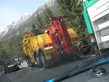 All my experiments with speed burned up a ton of fuel, and as a result it cost me €30 to go the first 300 or so kilometers. This works out to significantly less than 20 mpg. Along the way saw one accident being cleaned up, and came upon a half-dozen different repair crews fixing the armco. Mortality check. Eased off to 140 kph later in the day as I got more tired. So it may seem like the trip didn't start out all that well... Which is not the case. I refused to let the little stuff get me down and once I got to the Alps the Elise became much happier, playing in the curves which are clearly its element. I took it quite easy given my jetlagged state, but still enjoyed the car and the twisties immensely. Pretty much passed everyone, as always. At some point a blonde in an SLK AMG was keeping up with me so I let her by assuming she knows the road better. It was fun for a few kilometers as there was no traffic ahead. Then she turned off, and in a couple more turns I came up on a line of slower cars. Which turned out to be a blessing, since half a kilometer further on there were two Austrian cops standing by the side of the road pointing radar at me. Ha. Not this time, gentlemen (I do need to watch for that though). Through the alpine passes the traffic was occasionally held up by trucks, including one that broke down and required the biggest tow truck I've ever seen to get it removed.