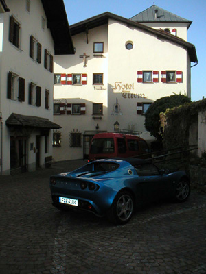 The Elise certainly turns heads - literally. On a few occasions kids gathered by the side of the road waved and even screamed. Also got the usual share of 'nice car' comments and 'what is it/how fast does it go' questions whenever I'd stop for gas or to ask directions. Typically this is the first Elise most people have seen and they usually assume it's a Ferrari despite the big LOTUS inscription on the back. Ah well, I guess the public at large is not very Lotus-informed even in Europe. Then back to the hotel, after filling up the car and buying a sponge to wash all the dirt from the day's drive, which I then accomplished in the hotel garage. Tomorrow I'm off to Switzerland so will just relax the rest of the day.