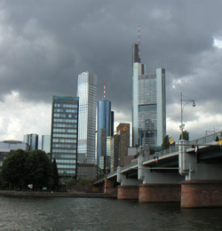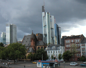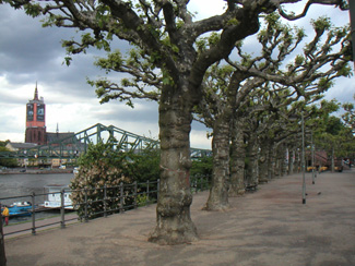 Took the back roads on the return trip to the hotel. For my 11 days rental I get 3,150 kilometers after which each additional one costs 34 cents. I've already driven 3,020 kilometers and it's about 90 to the rentacar place from the hotel. I considered returning the car early but upon re-reading the contract realized that it would be cheaper to just park it for a couple of days and hike around or just relax. The dinner at the restaurant was quite good. However all the gray hair around me is starting to make me feel very much out of place... Day 10. OK, maybe this is TOO peaceful. I can't relax here. Rather I feel like I'm going to go nuts. So I decided to return the Lotus early, checked out and headed back to Frankfurt. The return went without issues and all in all it ended up costing me €1,287 for 9 days and 3,100 kilometers. Well, that and about 10 tankfuls of gas at €30 each. I've seen and experienced so much already on this trip that I'm a bit Euro'd out. Took a train to the airport to see if I could come back early. No flights today but maybe I can get on the morning flight tomorrow - will have to just show up and hope they have space. Several of the local hotels were full, but the Marriot Courtyard had space - so I called their shuttle and they picked me up. The only non-smoking rooms were 'deluxe' at €120 a night but at this point I just wanted to have no stress and went for the 'deluxe' room. There is something to be said for the sterile comfort of American chain hotels. Decided to go into Frankfurt for a few hours. Traveled by bus, train and streetcar. In European cities it's easy to be carless. Weather is fairly nice with mostly sunshine and occasional torrential downpour. Frankfurt is a mix of old and new, mostly the latter. The walk along the river is scenic with several pedestrian bridges across. Relaxed by the river for a while. Cool. Much of the center away from the river is taken up by a gigantic shopping area many blocks long. Looked for souvenirs to take home but found nothing of interest. Kinda sad, amidst literally thousands of stores there's nothing for me to buy.