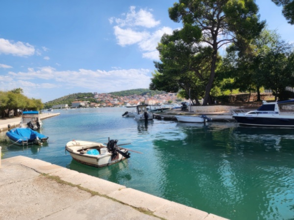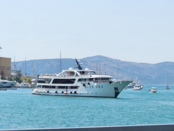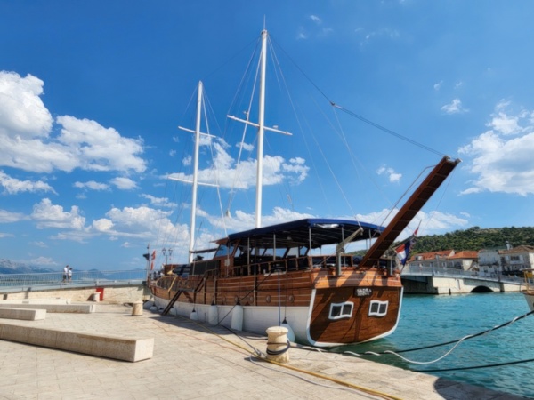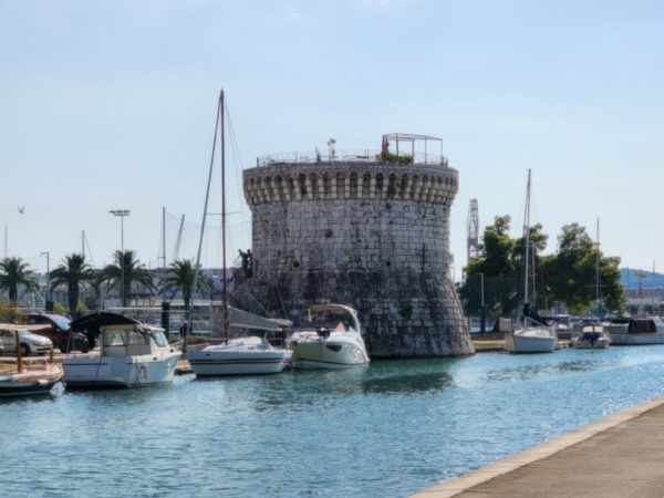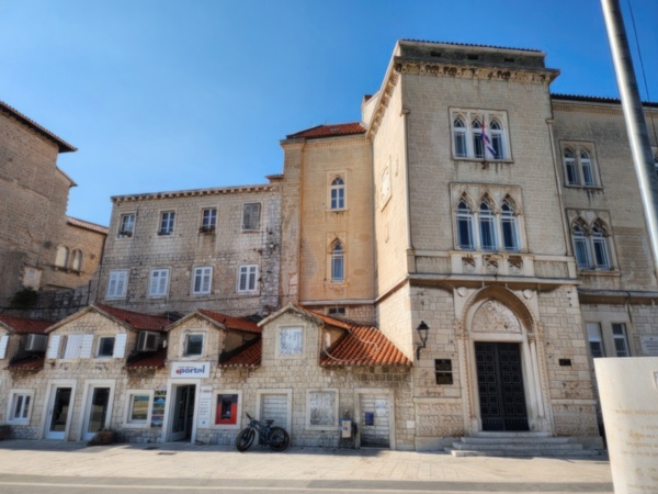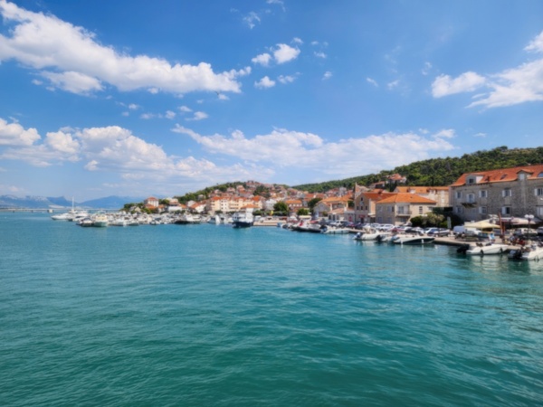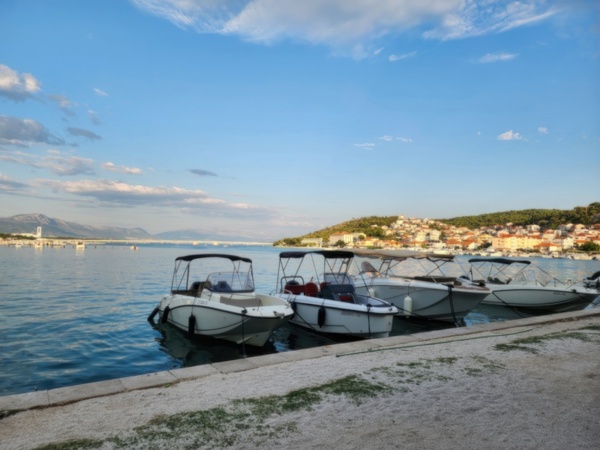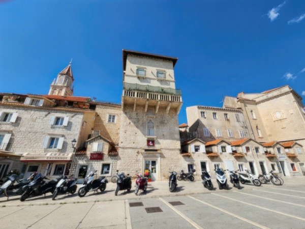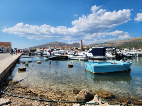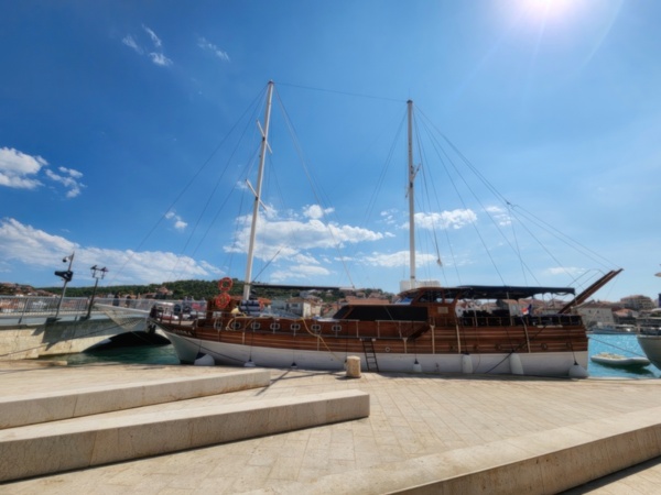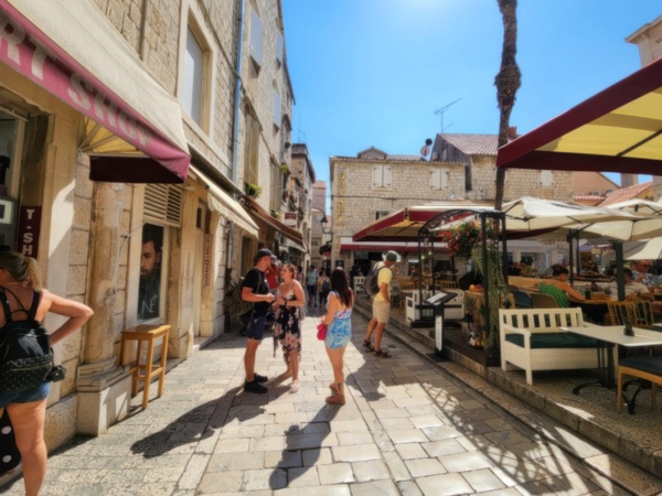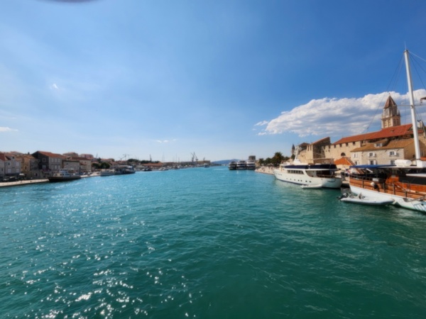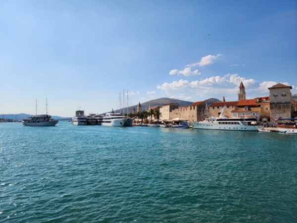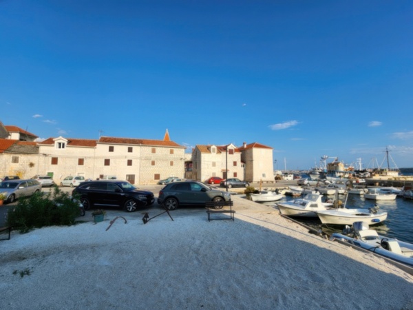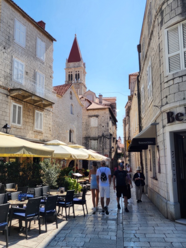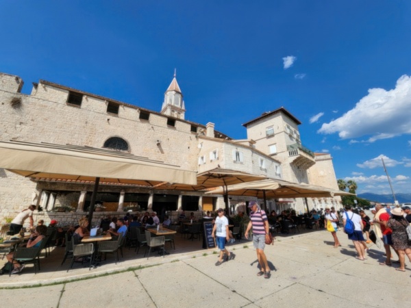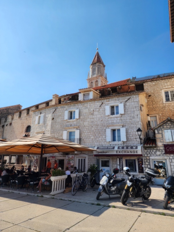 The Split airport is modern, compact, and uncrowded. Google tells me there is a bus to Trogir so I walk to the bus stop and take the 25 minute ride. It's a short walk from the bus terminal to the hotel, maybe half mile, that takes me through the old city. I'm glad that I travel with only a single backpack as luggage. Lugging multiple bags around would not have been much fun. Temperatures are in the high 80's.