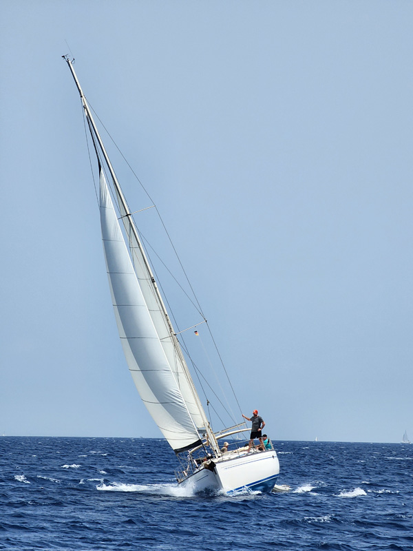 Soon the wind picks up, we raise the sails and are sailing! We are learning to work together as a crew. I need some refreshers, as does Randy, but we manage. Occasionally getting over 8kts of speed. Hull speed on this boat is about 9.5kts so we're not too far off. This is fun!