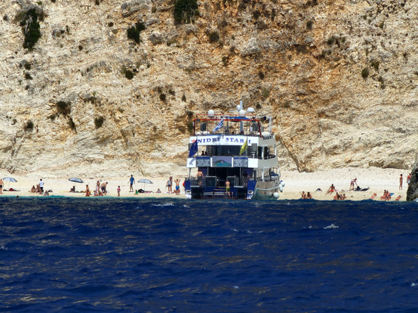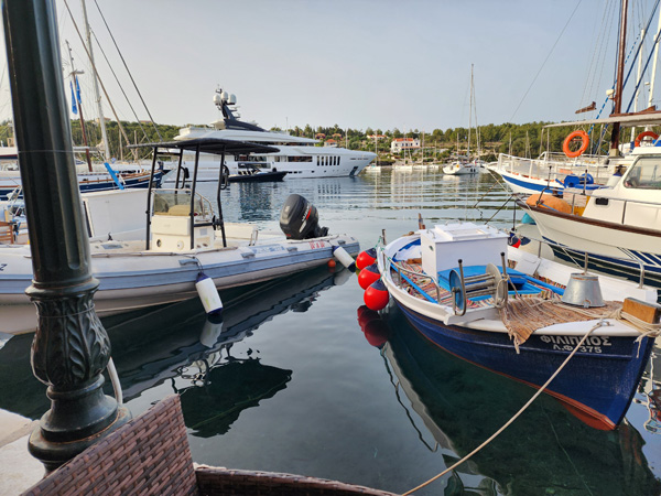 The beaches in Greece may look sandy from afar, and are often described as 'sand', but in fact just like Croatia they consist of pebbles that are roughly egg sized. Quite painful on bare feet and the one time I ventured ashore on a beach later I was very glad to have brought the water shoes I bougth on the Croatia trip. So if you're on a boat, just swim from the boat. Beach is more to look at than walk or lay on.