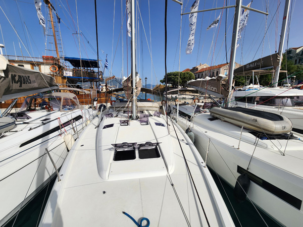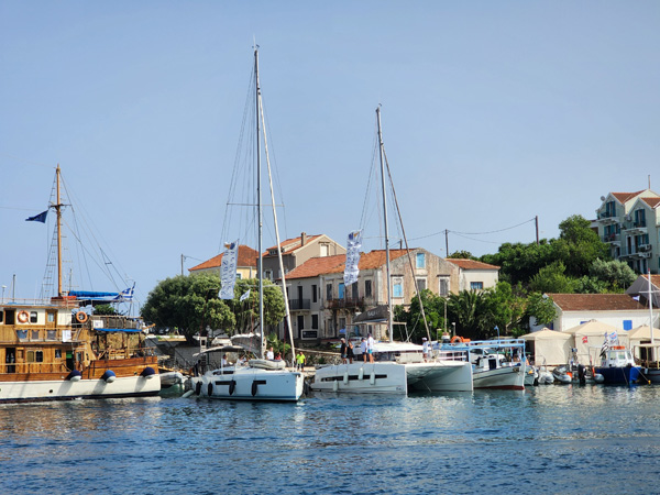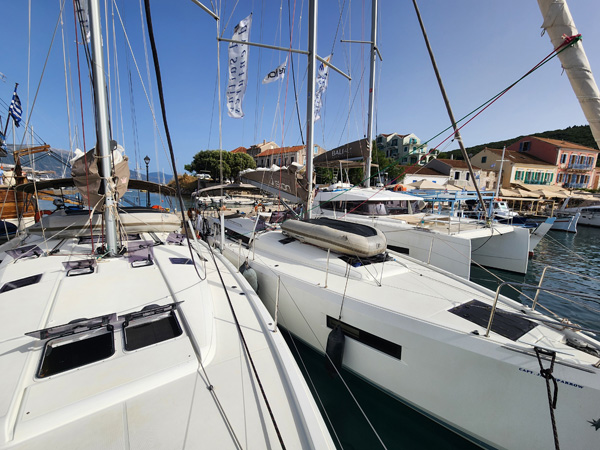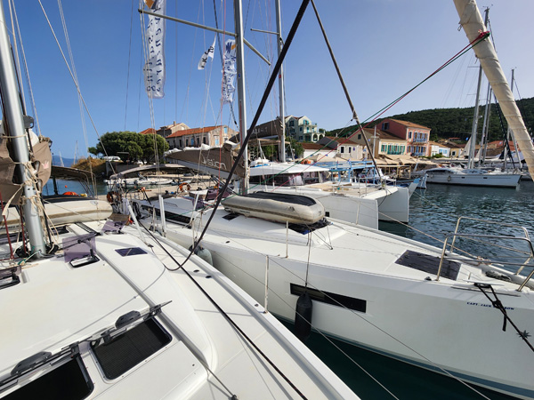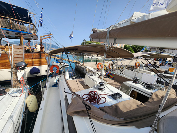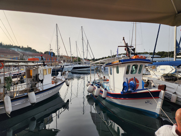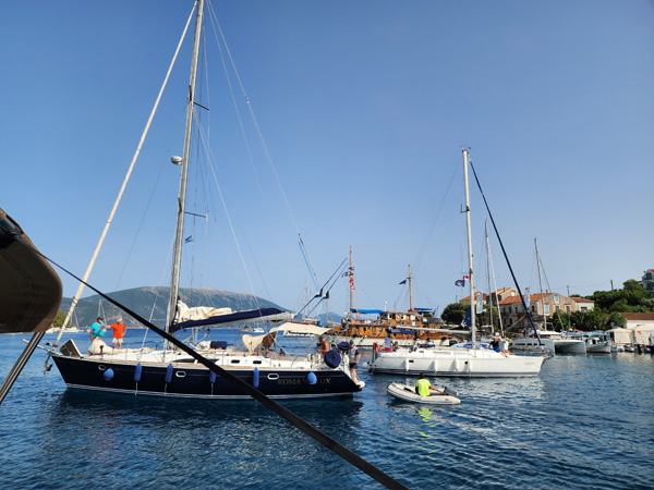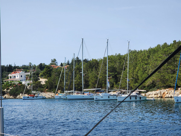 On our arrival the marina is full, but our local guide Spiros knows everyone on the islands (this proves to be the case over and over) and arranges for our flotilla to be rafted together. First boat is anchored and tied to the dock, the rest are tied to the first and each other (some also dropping anchor before backing in to stabilize the whole thing). Good practice doing that.