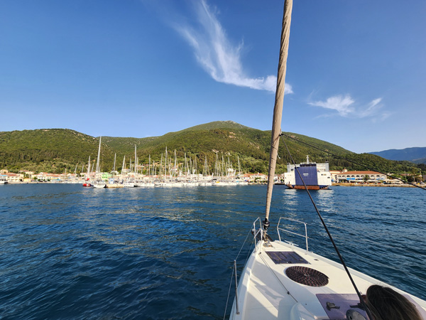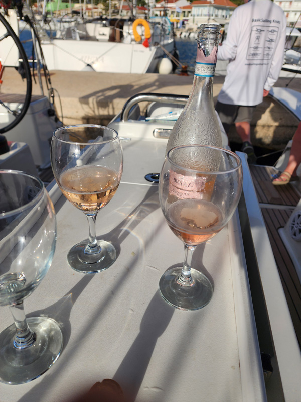 Day 6 - Sail to Sami and my birthday No worse for wear from the night before, to the surprise of some, ready to face whatever the day may bring. A good way to kick off my 60th year on this planet. Thank you again to my dad and stepmom for this gift. As far as birthday presents go, this is way up there. We set sail in good winds, get lots of practice running different points of sail, and get some fun speeds. Satisfying. The winching is a lot of work - I'm definitely getting my exercise.