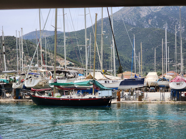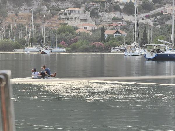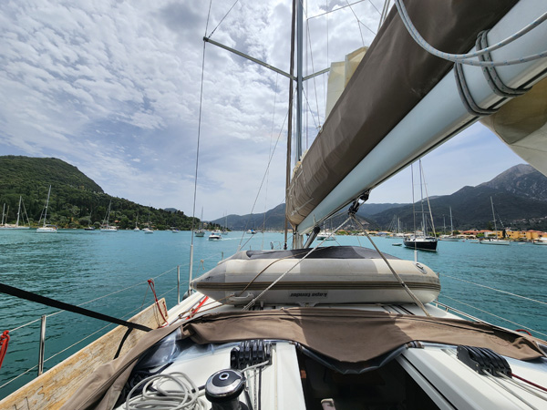 Day 9 - Untangling the chains, Sail to Meganisi In the morning we watch another boat leave, and sure enough he snags someone else's chain on his anchor. The process for dealing with this is fairly straightforward. First, maneuver back and forth while raising and lowering anchor to get it as close to the surface as possible, and ideally above it. Then take a line, make a loop on the end of it, and lower it on the far side of the tangled chain. Next, use a boat hook to pull the loop under the chain and back up to the boat. Cleat both ends of the line with as much tension as practical to support the chain. Then lower the anchor from under it, and once free pull it up and release the line to drop the chain. The maneuver was performed perfectly and got applause from both sides of the harbor. Then it was our turn. To overachieve a bit, we snagged not one chain but three!!