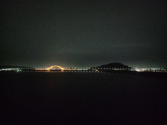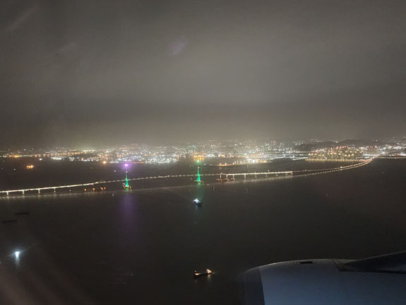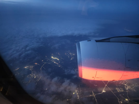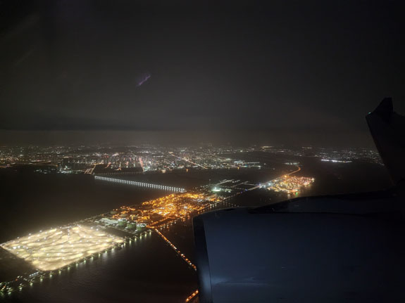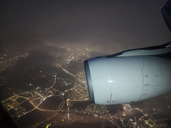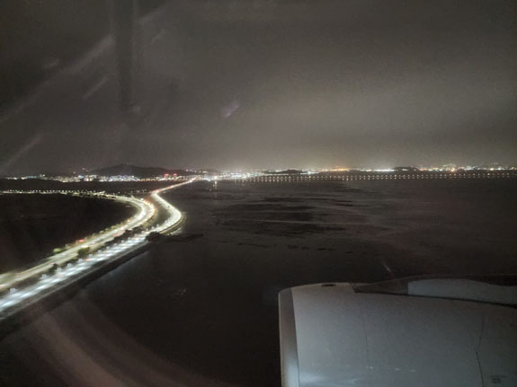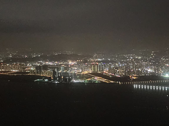 Approach to Seoul is in the dark. The city looks cool from the air.