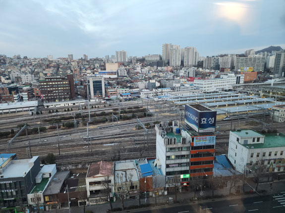 Due to windows being on two adjacent walls, the view ends up being a bit over 180 degrees in all, overlooking the train station to the West.