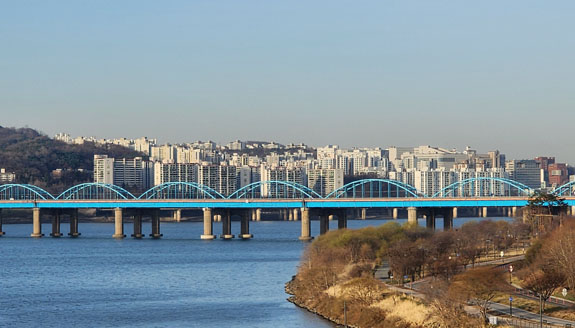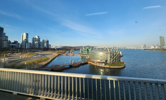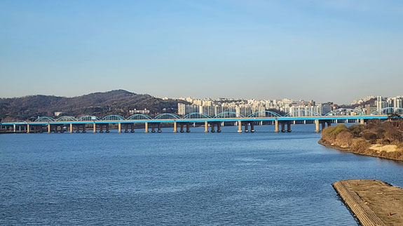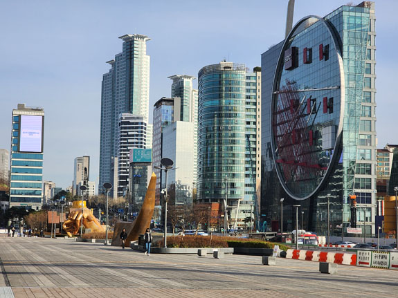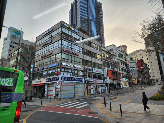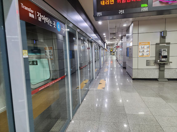 However, the public transport uses an electronic system. One can purchase a 'TMoney' physical card and then fill it up via either credit or cash at machines in subway stations. Similar to the Octopus electronic cash card that's been in use in Hong Kong for over two decades. For foreign visitors, there is an option of buying a 'Tour Card' which acts as a transportation card and also gives discounts at various touristy places. There is a mobile app version of it so that's what I do. The base 'card' costs KW3,000 (about $2.50) and you can fill it up with credit card in KW5,000 increments. Once loaded, you launch the app and put the phone on the NFC pad both entering and exiting buses or subway stations. You get charged a base fee on entrance. On exit, you might get charged more if you traveled sufficiently far. Or you might get temporary credit towards a transfer if you haven't used the full base fee. The credit expires in a relatively short perioud of time, I think a half hour? Having all that figured out, Tour Card app installed and loaded with KW10,000 to start, I am ready to go. The apartment is cool. In all my travels I've been looking for what is the right size dwelling for one person. This, I think, is it. Looks to be about 450 square feet (15x30?). two walls have windows, all closets/kitche/accessories along one wall. The rest of the space separated into two sub-rooms and a bathroom. The bed is in the corner here, I would probably put the 'living room' there if it were my own. But it works overall.