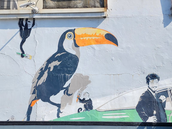 In the picture below, I wonder if anyone ever sits in the murals' lap? It's definitely arranged to be snapshot bait, what with table placement and all. I take the bait and so the snapshot.