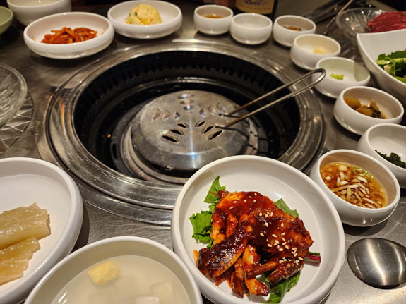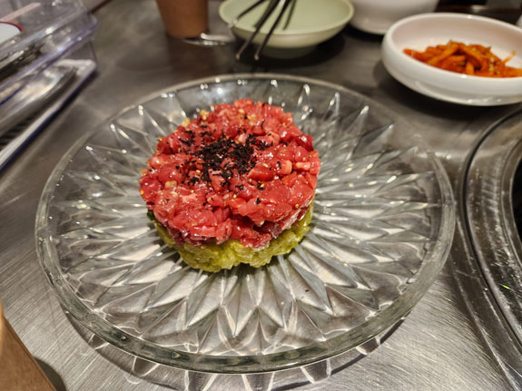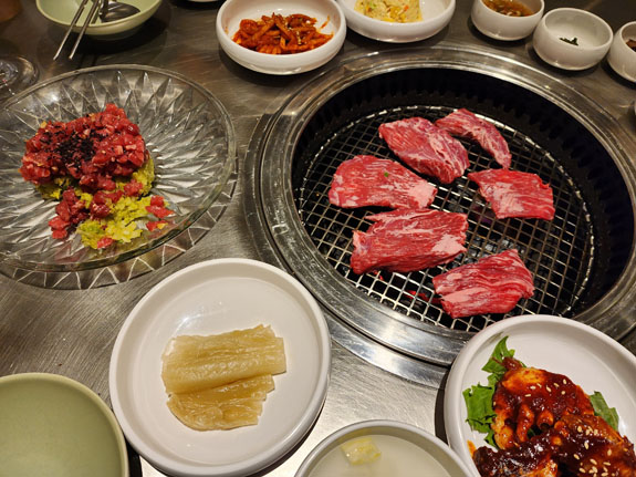 It's a traditional Korean barbecue place. I show up a bit early and while the staff speak virtually no English they do communicate that the place is full, sorry. I have no luck conveying that there is a reservation, so I just wait outside for my date. She arrives and we are seated, with what I interpret as apologies towards myself. All part of the experience. She does the ordering, asking if I eat raw meat. Sure. So steak tartar is part of the meal. I had that in Paris several years ago, and it did not agree with me in a profoundly debilitating way. Hopefully this wil be better. I'm feeling adventurous.