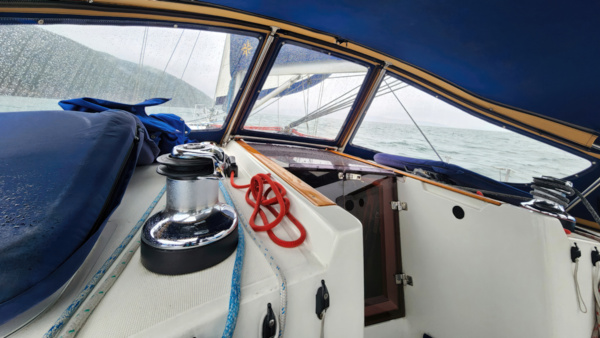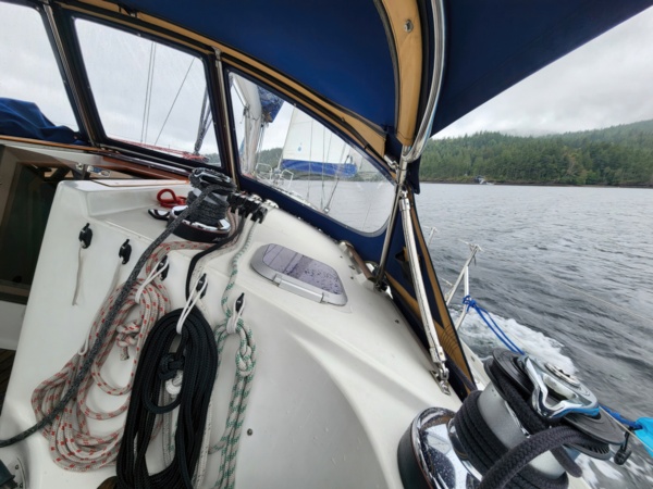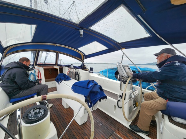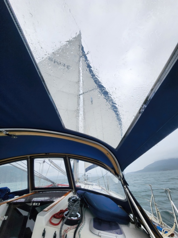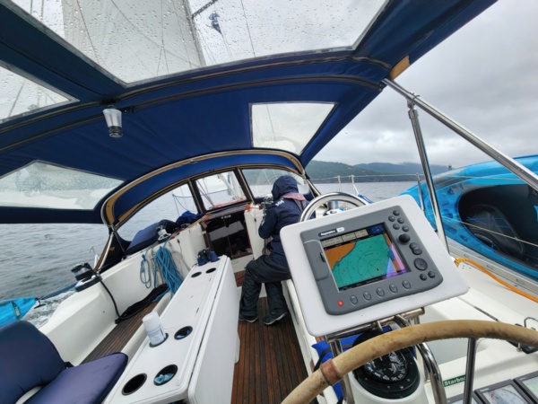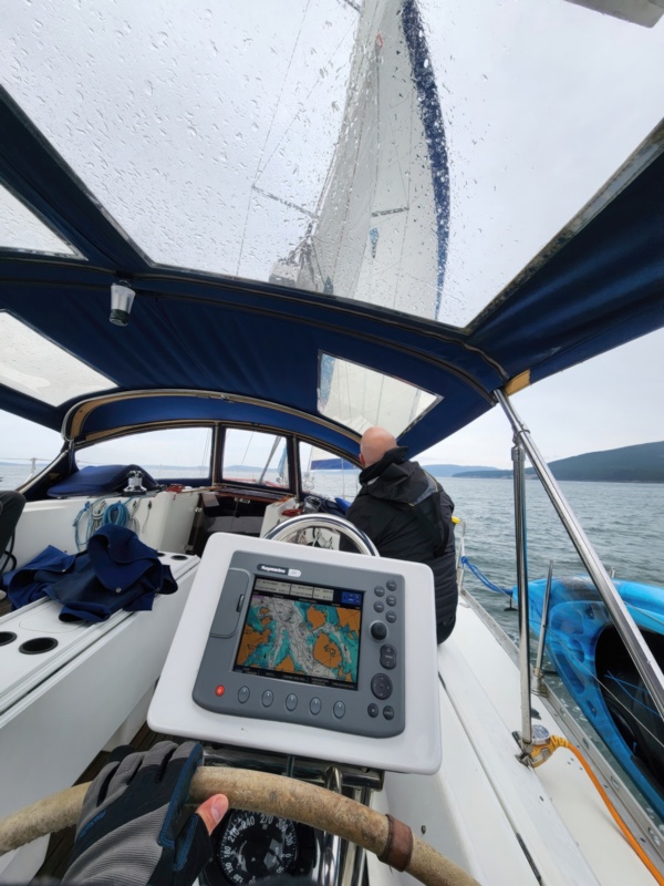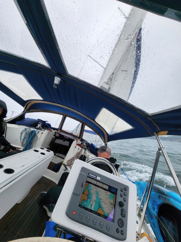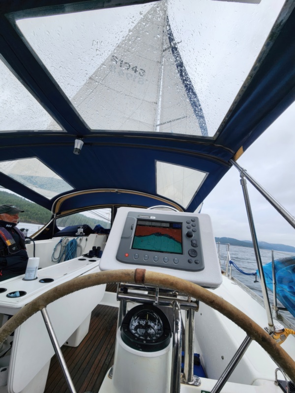 After some introductions and a briefing on the boat/rules, we're off. The other two students are slightly younger than me, divorced males like myself, looking for what could be the next stage in life. I know how that goes :). Steven I don't get to learn much about (more on that later). Scott is a doctor with a varied and interesting history, and an experienced powerboater but new to sailing. Both have a dream of owning a sailboat. Me, I just want to get better at renting. The weather is cold-ish (mid 50F), rainy and with shifting but persistent winds. I'm glad I bothered to look it up beforehand and brought a couple jackets and hat. The bimini top keeps direct rain off us but I still get soaked. And I still end up catching a cold first day that persists for the duration. All part of the experience.